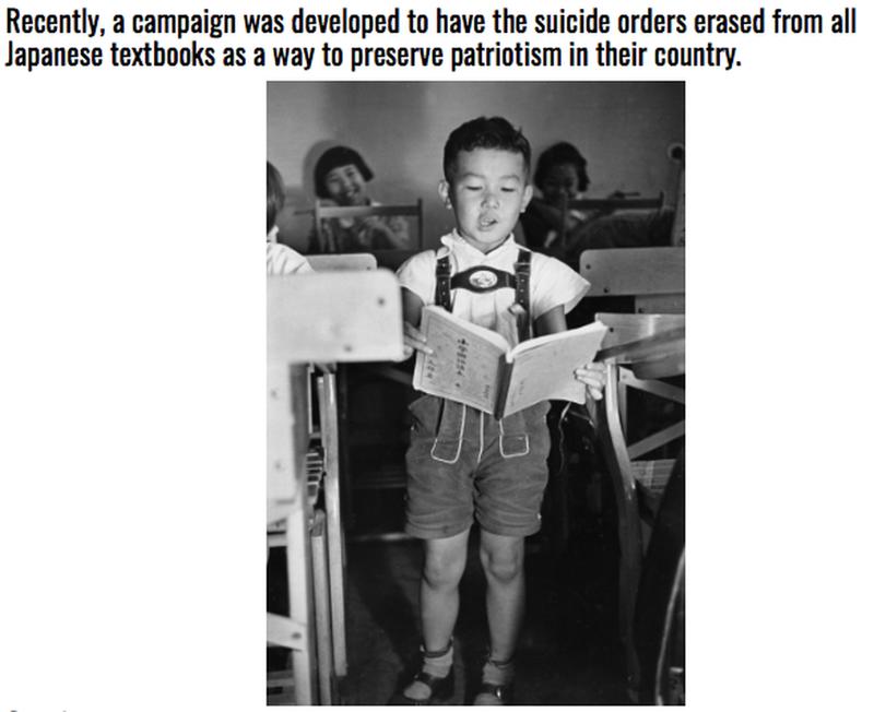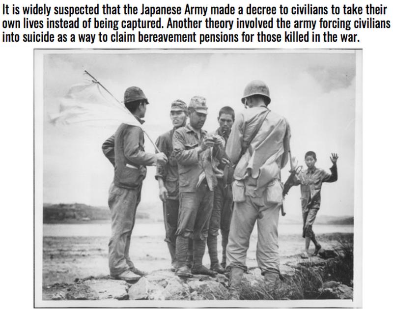 Following U.S. attacks on Saipan and Okinawa, thousands of Japanese civilians took their own lives. According to some accounts, many civilians were coerced into killing themselves and were provided grenades by the Japanese Imperial Army to do so.