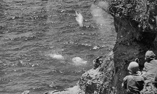 Desperation. Saipan civilians jump off Banzai Cliff rather than surrendering to American troops after the Japanese defeat in July 1944. Around 1,000 civilians perished this way.