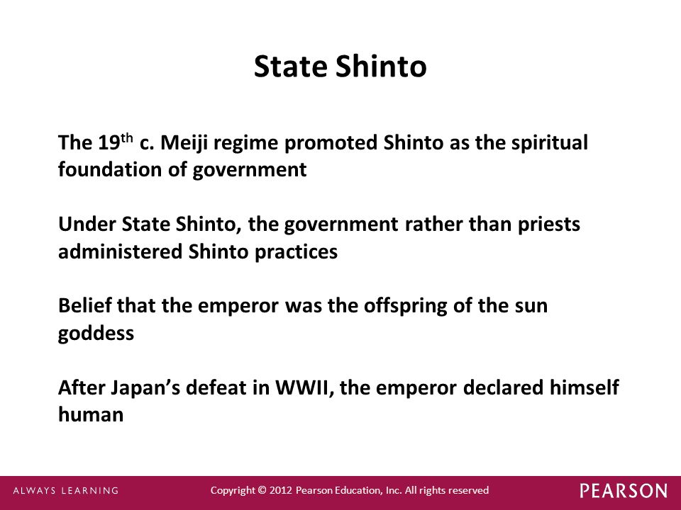 The Meiji leaders started State Shinto, a new state religion based on Shinto, to promote the divine status of the the emperor as a new god of Japan.